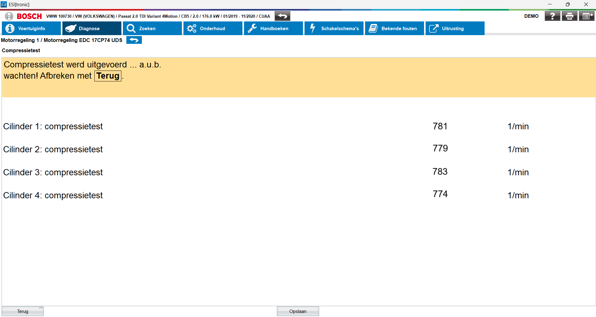 Compressietest met de Bosch KTS. Volgens de technische documentatie mag het onderlinge toerentalverschil niet hoger zijn dan 71 toeren per minuut