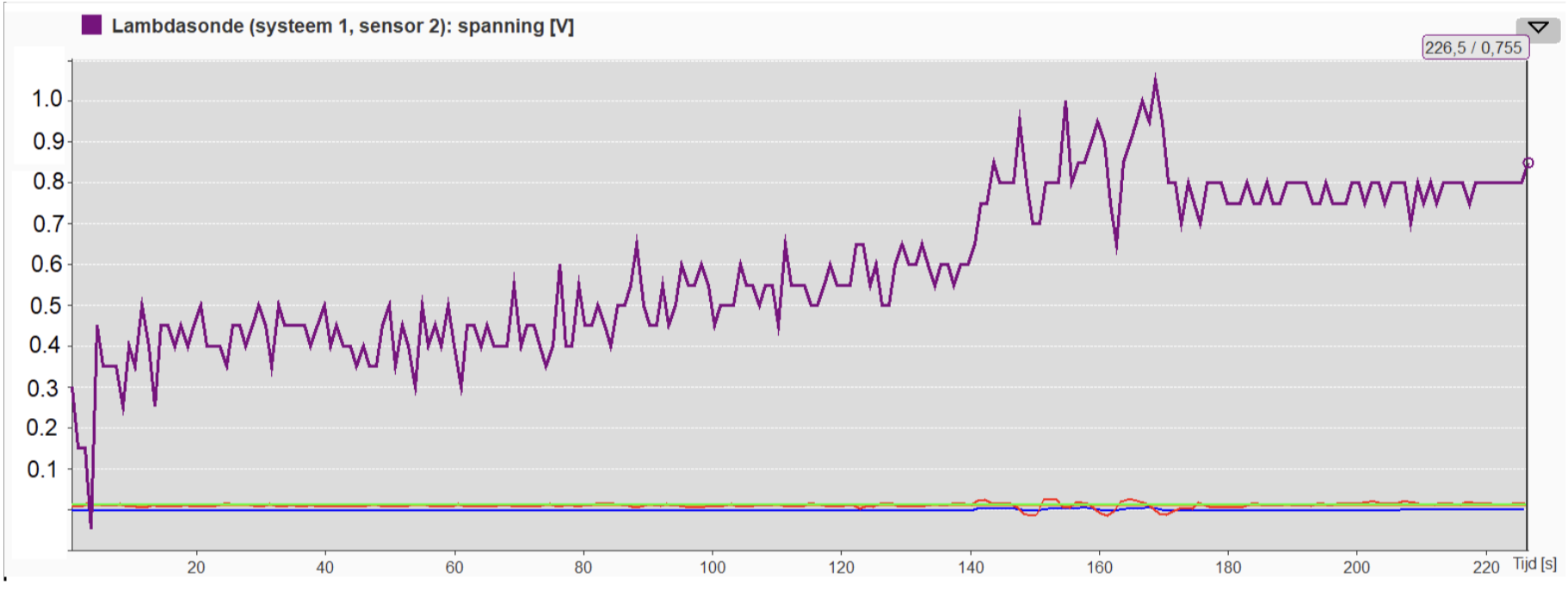 Uit de meting blijkt dat de spanning van de achterste sonde bij constante snelheid af en toe tussen 0,6 en 0,9 Volt fluctueert. Dit betekent dat het motormanagement terecht de foutcode P0420 vastlegt.