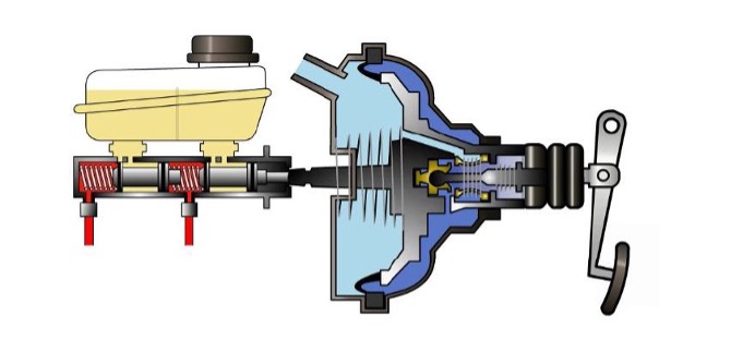 Fotobijschrift: Hoofdremcilinder met rembekrachtiger en vloeistofreservoir