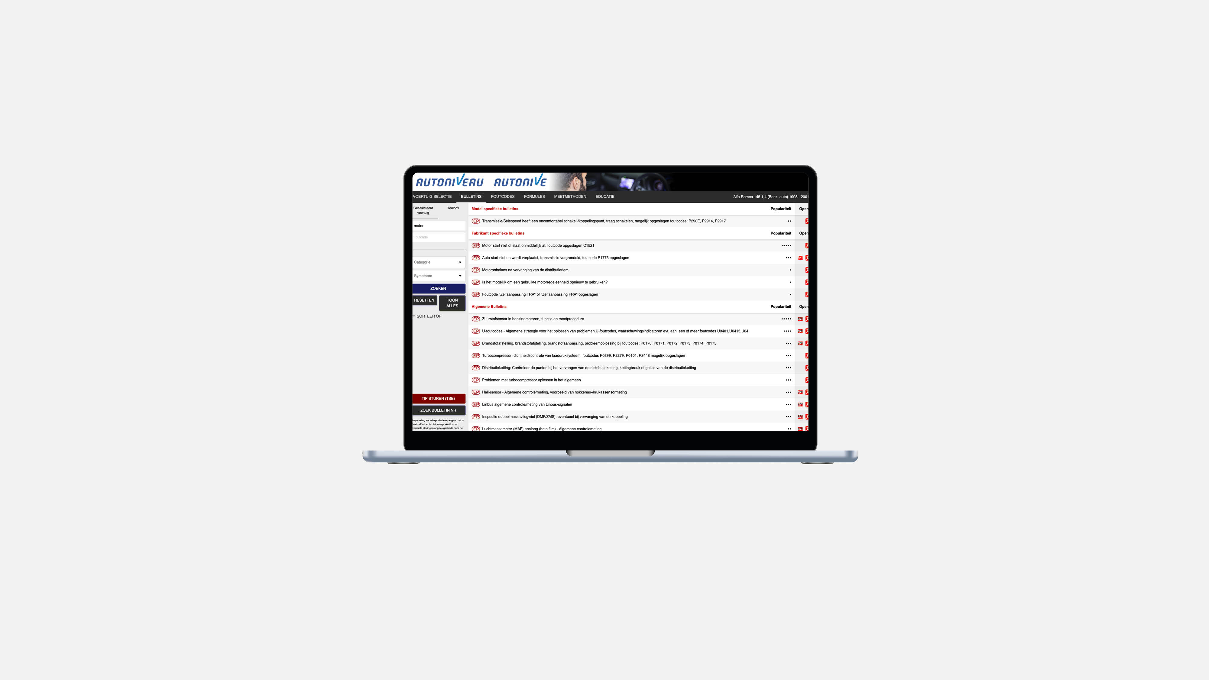 Je kunt in AutoNiveau Solutions Pro zoeken op kenteken, chassisnummer, merk, model en bouwjaar of foutcode. Vervolgens klik je op het PDF-icoontje en het PDF-bestand met uitleg over de foutcode en hoe de storing op te lossen, vaak inclusief foto’s, verschijnt in beeld!